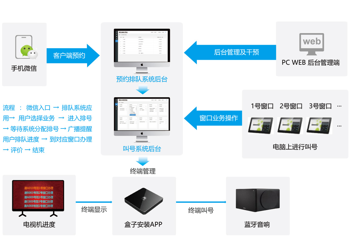 微信预约排队叫号解决方案,可以实现微信预约、排队状态查询及服务评价;现场服务窗口支持实时叫号、大屏服务状态显示,使服务或营业性场所的服务效率和服务满意度大幅提升。